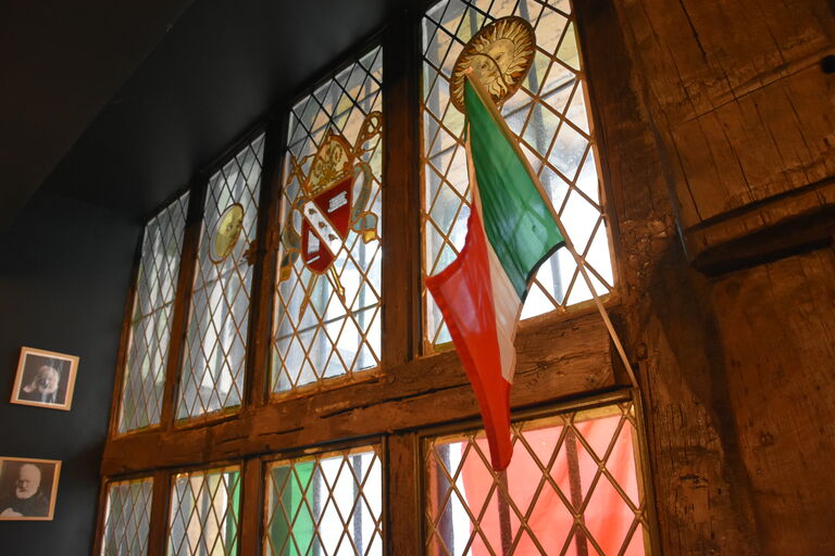Autour du four à bois artisanal, la salle refaite à neuf conserve ses éléments historiques : cheminée, fenêtres, vitraux portant la marque de la famille royale et de l’Église. Cette maison possède même son propre puits (à côté du four), signe intérieur de richesse.